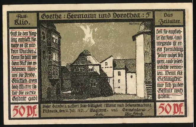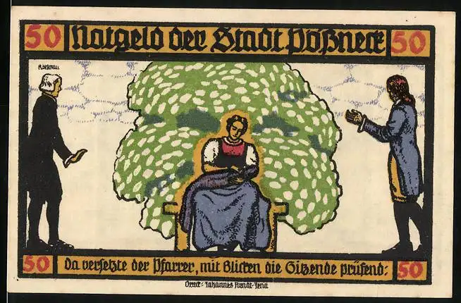 Notgeld Pössneck, 1921, 50 Pfennig, Szene mit Pfarrer und Goethe-Zitat, Stadtansicht im Hintergrund