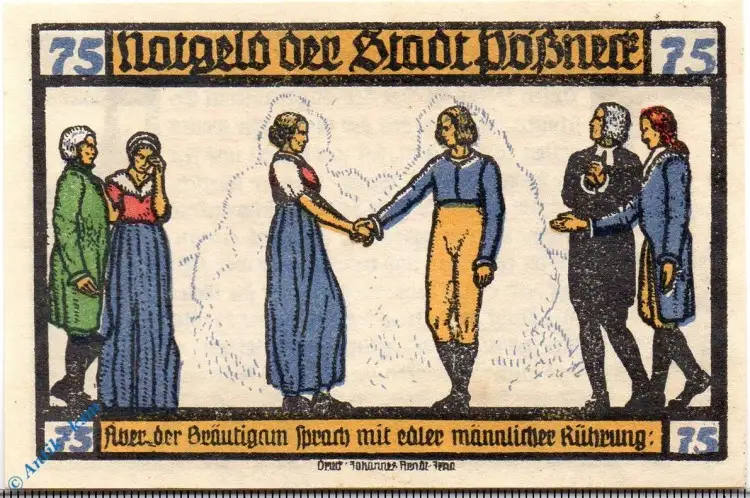 Notgeld Pößneck , 75 Pfennig Schein Nr 10 , olivgrau o. Signatur , Mehl Grabowski 1066.4 b , von 1921 , Thüringen Serien Notgeld