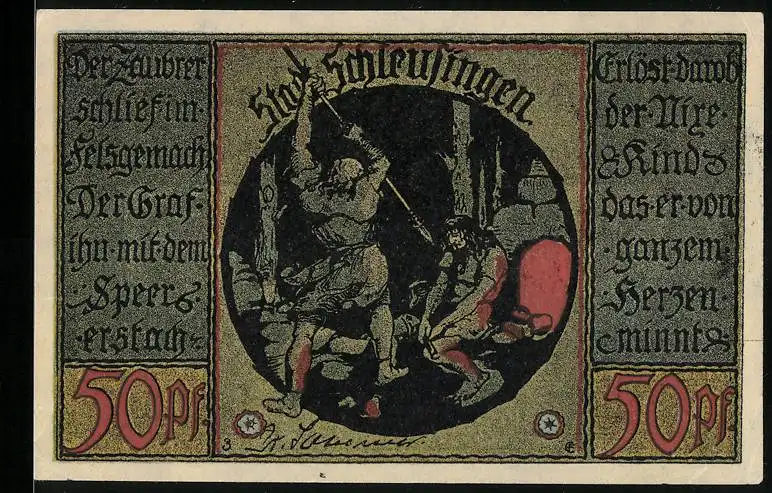 Notgeld Schleusingen, 50 Pfennig, Das Pförtchen, Graf ersticht den Zauberer