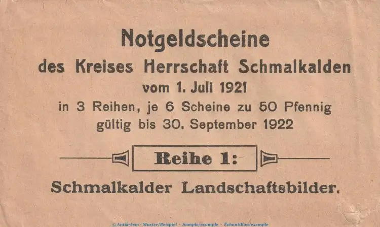 Notgeld Schmalkalden , Umschlag Serie 1 , Verkaufsverpackung zu Mehl Grabowski 1184.1 , von 1921 , Thüringen Seriennotgeld
