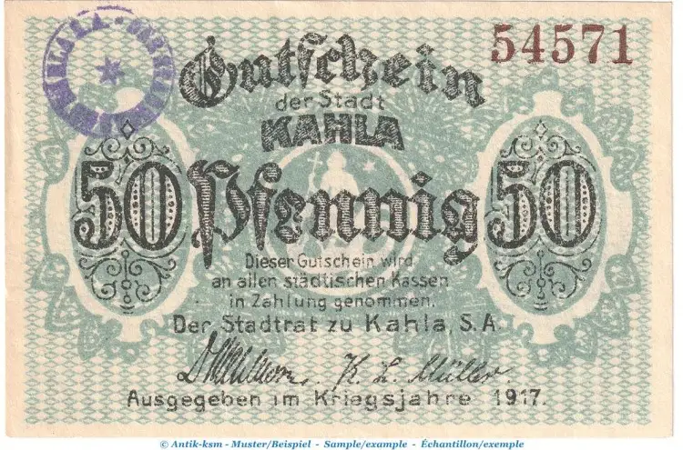 Notgeld Stadt Kahla , 50 Pfennig Schein in kfr. Tieste 3325.05.15 von 1917 , Thüringen Verkehrsausgabe