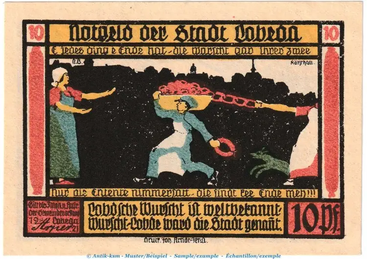 Der Notgeldsatz besteht aus : 10 Pfennig Schein , lange Wurst
