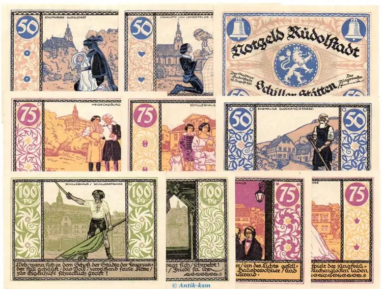 Notgeld Stadt Rudolstadt 1146.2 , Schiller Set mit 10 Scheinen in kfr. von 1921 , Thüringen Seriennotgeld