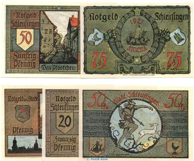 Banknoten , Notgeld der Stadt Schleusingen , SeriennotgeldBundesland : Thüringen  ,  Mehl / Grabowski  : 1181.1 und 2