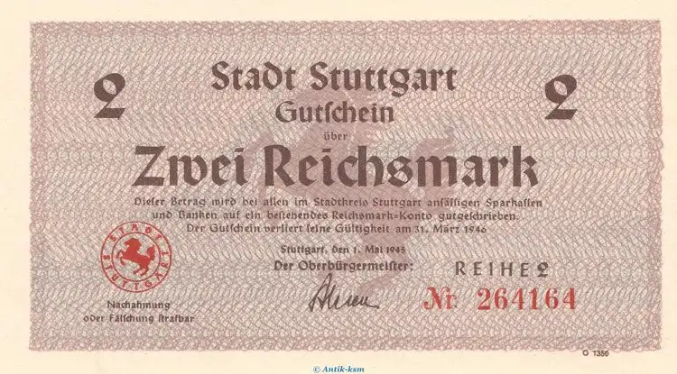 Notgeld Stadt Stuttgart , 2 Reichsmark Schein in kfr. von 1945 , Württemberg Notgeld 1945-48
