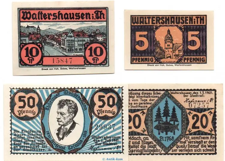 Notgeld Stadt Waltershausen 1374.1 , Set mit 4 Scheinen in kfr. von 1921 , Thüringen Seriennotgeld