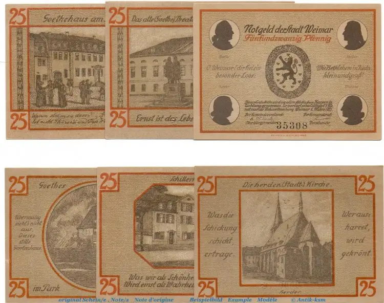 Notgeld Stadt Weimar 1398.1.a , Set mit 6 Scheinen in kfr. von 1921 , Thüringen Seriennotgeld