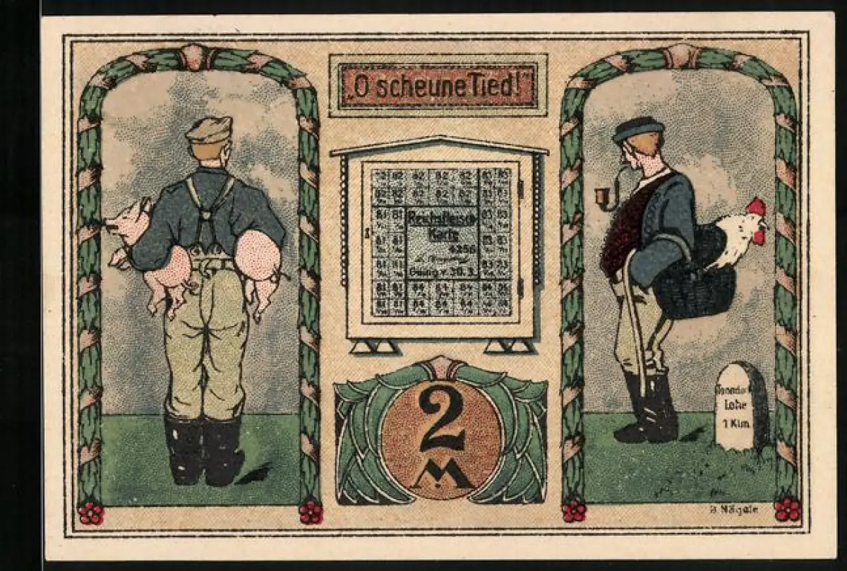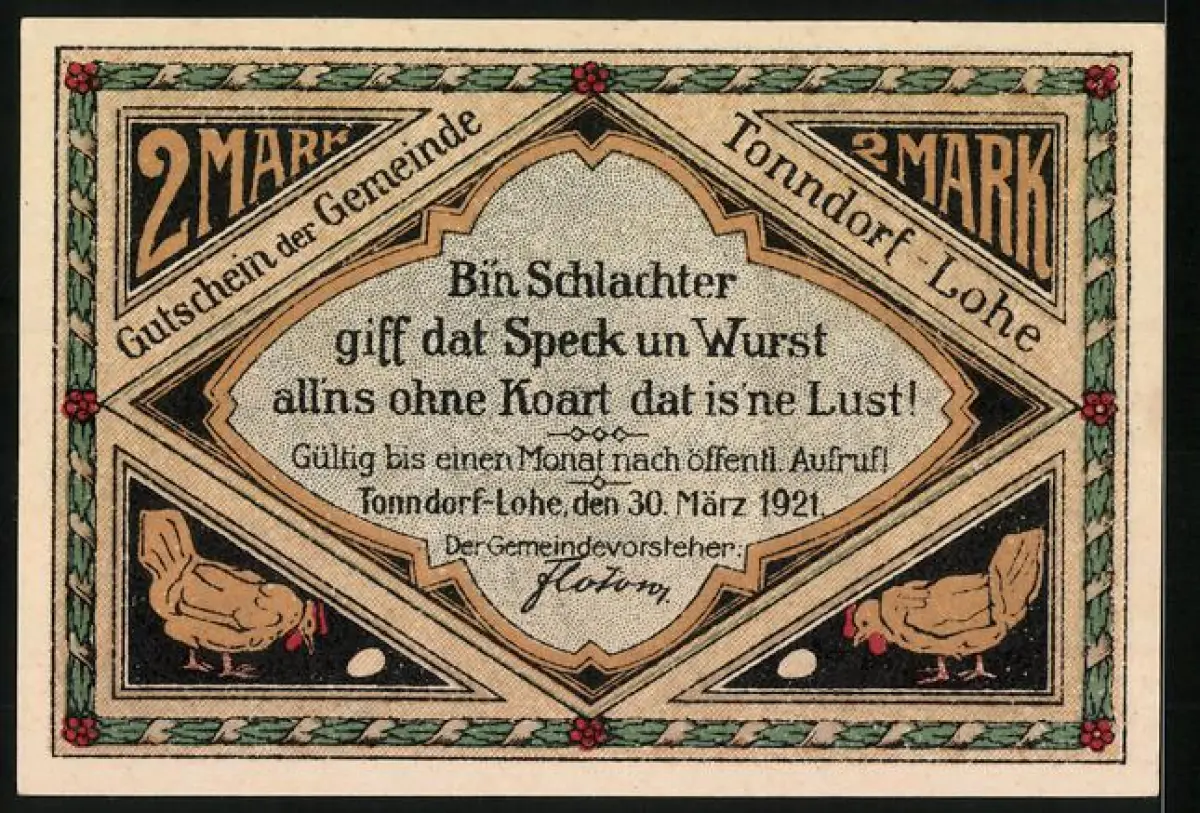 Notgeld Tonndorf-Lohe 1921, 2 Mark, Metzger mit Schwein und Huhn, plattdeutscher Text