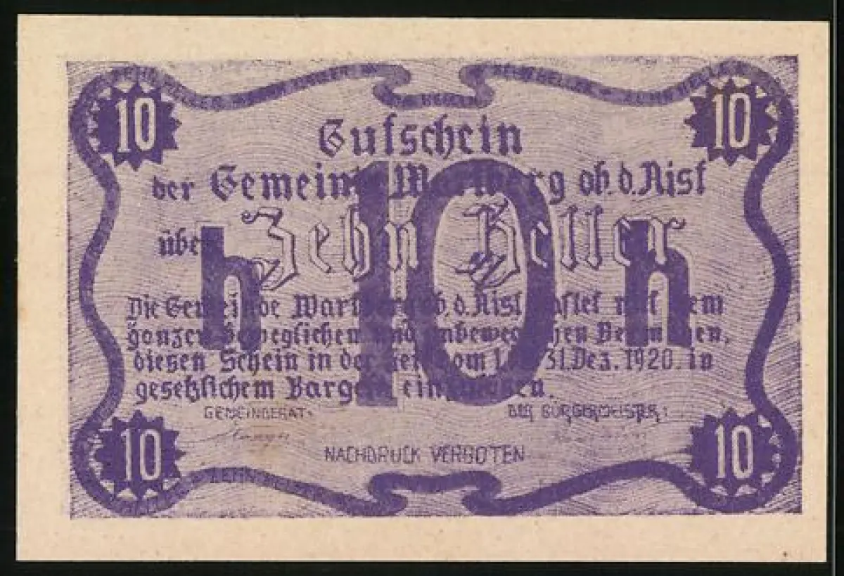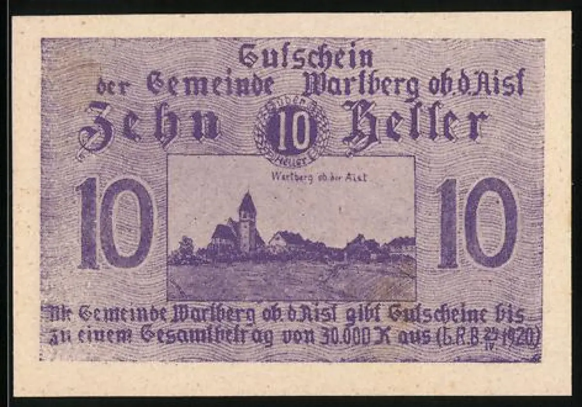 Notgeld Wartberg ob der Aist 1920, 10 Heller, Dorfansicht mit Kirche