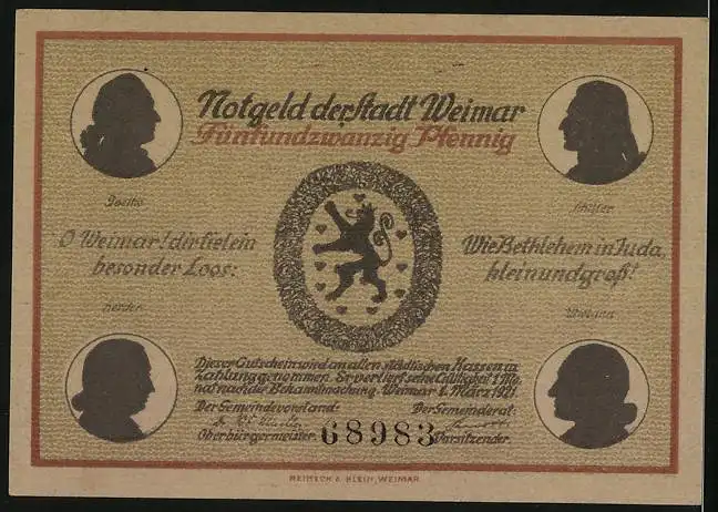 Notgeld Weimar 1921, 25 Pfennig, Stadtkirche Herder, Goethe