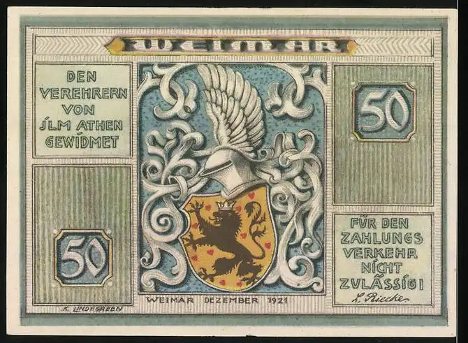 Notgeld Weimar, 1921, 50 Pfennig, Goethes Wohnhaus, Stadtwappen und Hinweistext