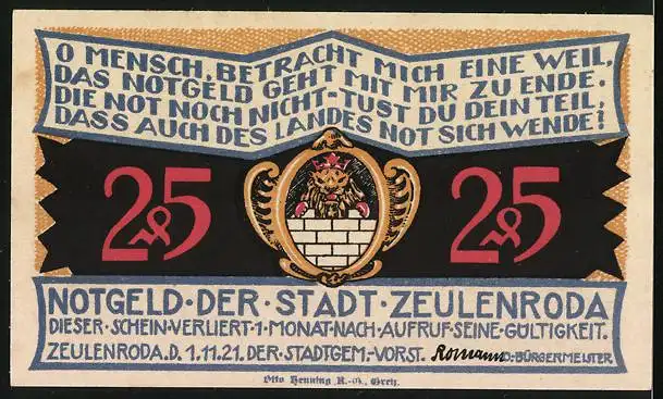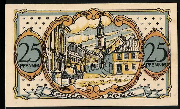 Notgeld Zeulenroda 1921, 25 Pfennig, Strassenpartie mit Turm, Wappen