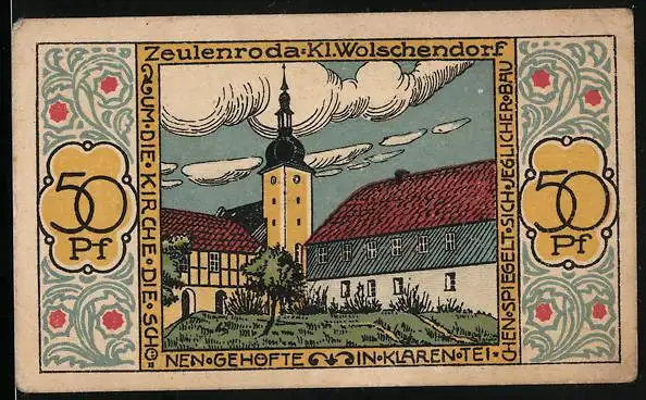 Notgeld Zeulenroda 1921, 50 Pfennig, Kirche, Gehöfte in Klaren, Wappen