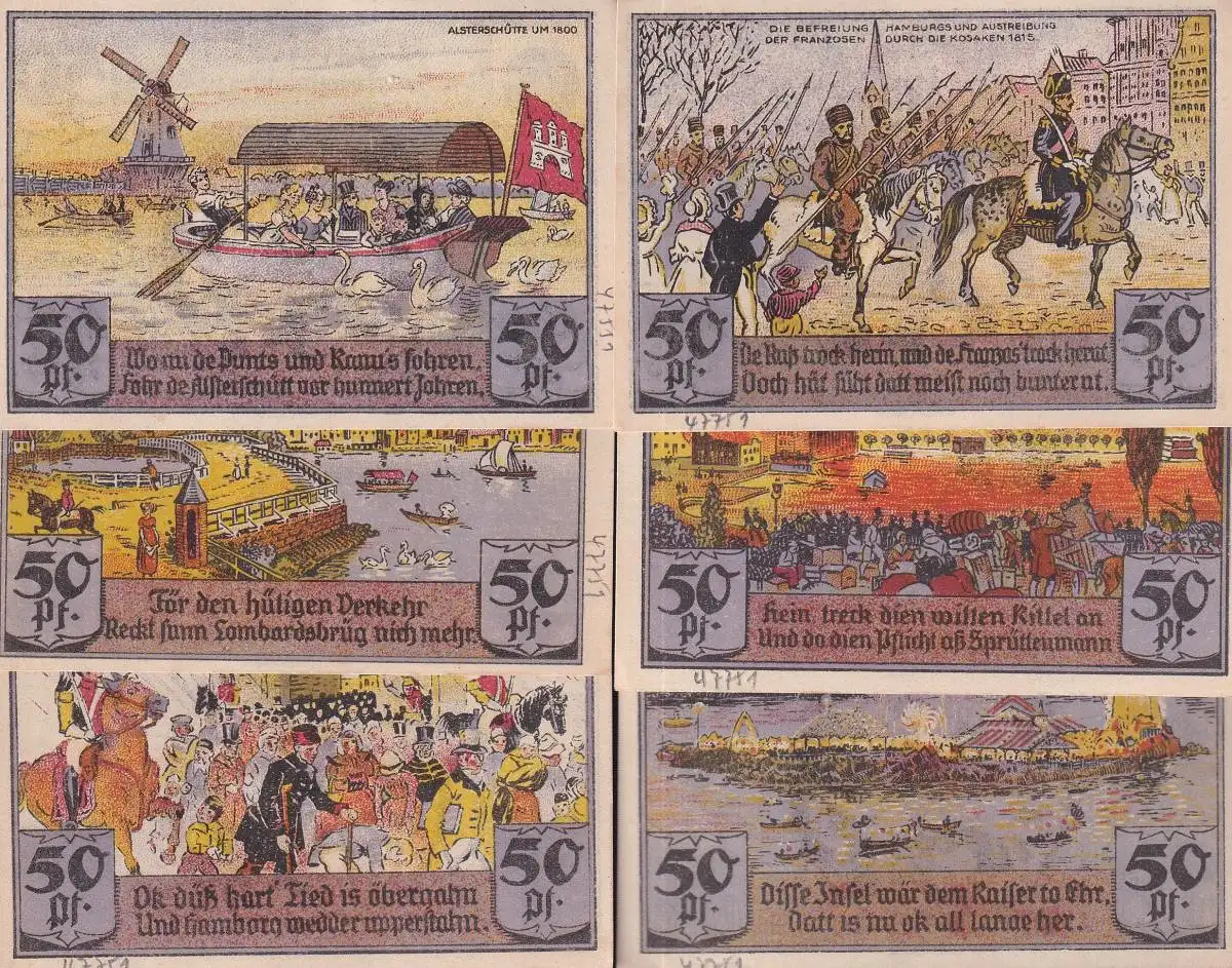 6 Scheine à 50 Pfennig, gültig ab 1. September 1921. Vign. des Hl. Georg u. Geldwert, verso "Alsterschütte um 1800", "Holzdamm mit Lombardsbrücke um 1800", "Befreiung Hamburgs u. Austreibung der Franzosen durch die Kosaken 1813", "Austreibung der Bürger durch die Franzosen 1813", "Hamburger Brand 1842", "Die Kaiser- oder Alsterinsel am 19. Juni 1895", jeweils in plattdeutschen Versen kommentiert. - Die oft aufwendig gestalteten Kleingeld-Scheine wurden, aus Mangel an Münz-Kleingeld vor allem ab 1916 bis 1922 ausgegeben (vgl. transpress Lexikon Numismatik, S. 332)