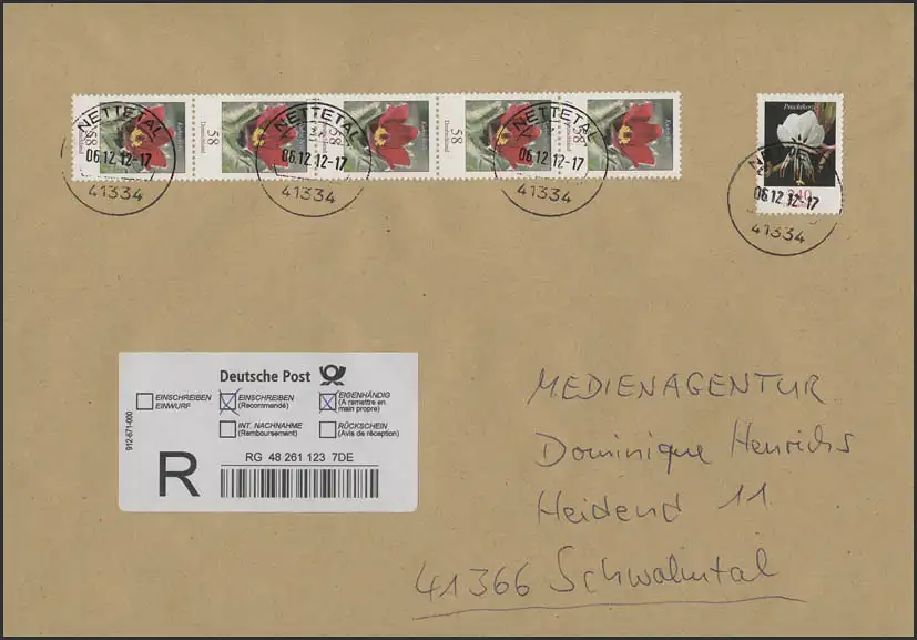 2968/2969 Fleurs 58/240 cent - Valeurs complémentaires du 6.12.2012 DROIT DE PORTOGE à l'inscription de remise Privé 145 + 205 + 180 = 530 centimes, avec preuve de livraison Déjà le 6/12/2012 apparurent les nouvelles marques permanentes - nécessaires pour le changement de port le 1.1.2013. Les Frankaturen de Porto ne pouvaient pratiquement pas être utilisées dans l... Numéro de catalogue: 2968/2969 Examen: original Numéro d'article: 50000296801501