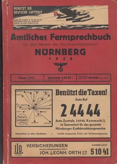Nürnberg. - Herausgeber: Reichspostdirektion: Amtliches Fernsprechbuch 1938 für den Bezirk der Reichspostdirektion Nürnberg. Ausgabe Mai, Stand vom 15. März 1938. - Inhalt: I. Vorbemerkungen. II. Ortsverzeichnis. III. Verzeichnis der Teilnehmer. Mit Hande