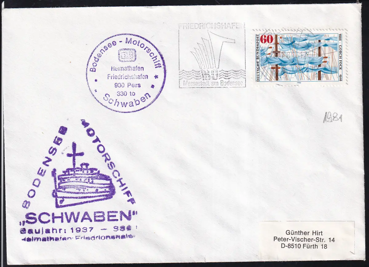 OSt. Friedrichshafen 20.7.81 2 Cachets MS Schwaben auf Brief