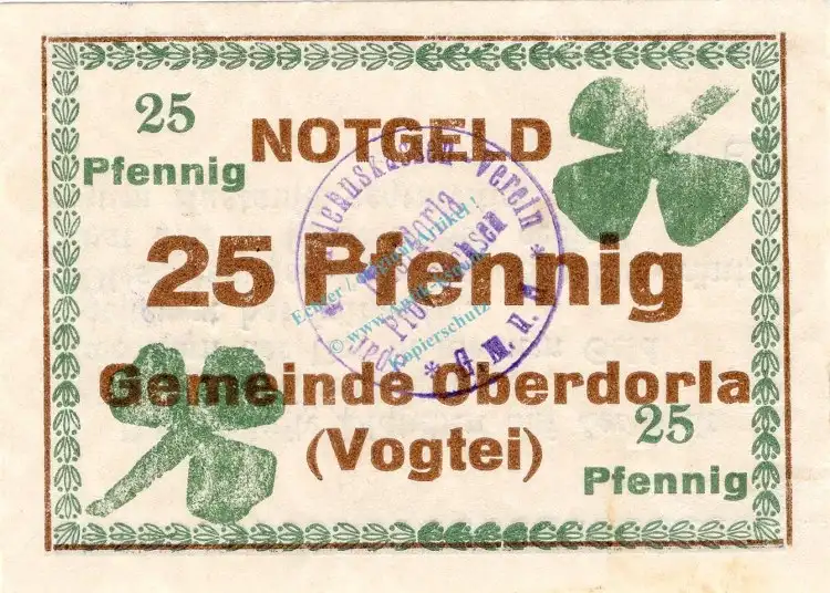 Oberdorla , Notgeld 25 Pfennig Schein unc-kfr. Ti.5225.05.10 , Thüringen o.D. Verkehrsausgabe