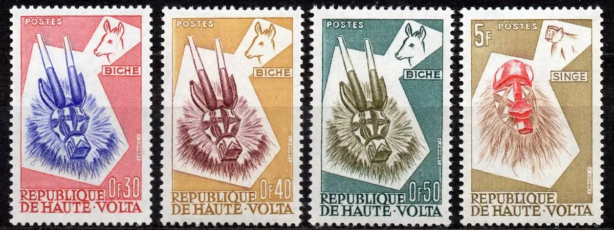 Obervolta, Mi-Nr. 71, 72, 73 + 77 **, Tiermasken der Bobo-Stämme