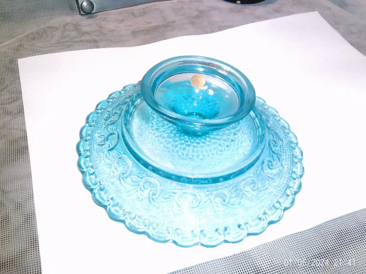 Obst Kekse Türkis Glas Fußschale um 1920 Durchmesser: 15 cm Höhe: 55,5