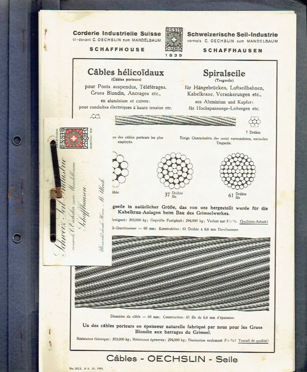 guter Zustand, geringe Gebrauchs- und Alterungsspuren: Mappe an den Rändern vergilbt und defekt, teils leicht verschmutzt - Seiten überwiegend sauber und ordentlich, erste und letzte Seite teils gering rostfleckig von der Mappe, Spiralseile - Litzen-Seile - Verzinkte Drahtschnüre und -Seile - Ox-Lay - Ideal, kartoniert, ca. 22,5 x 31, Mappe mit Prospekten = 12 Seiten mit zahlreichen Bildern und 1 Visitenkarte