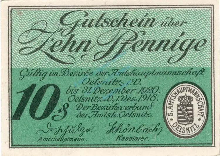 Oelsnitz , Notgeld 10 Pfennig Schein unc-kfr. Ti.5325.05.15 , Sachsen 1918 Verkehrsausgabe