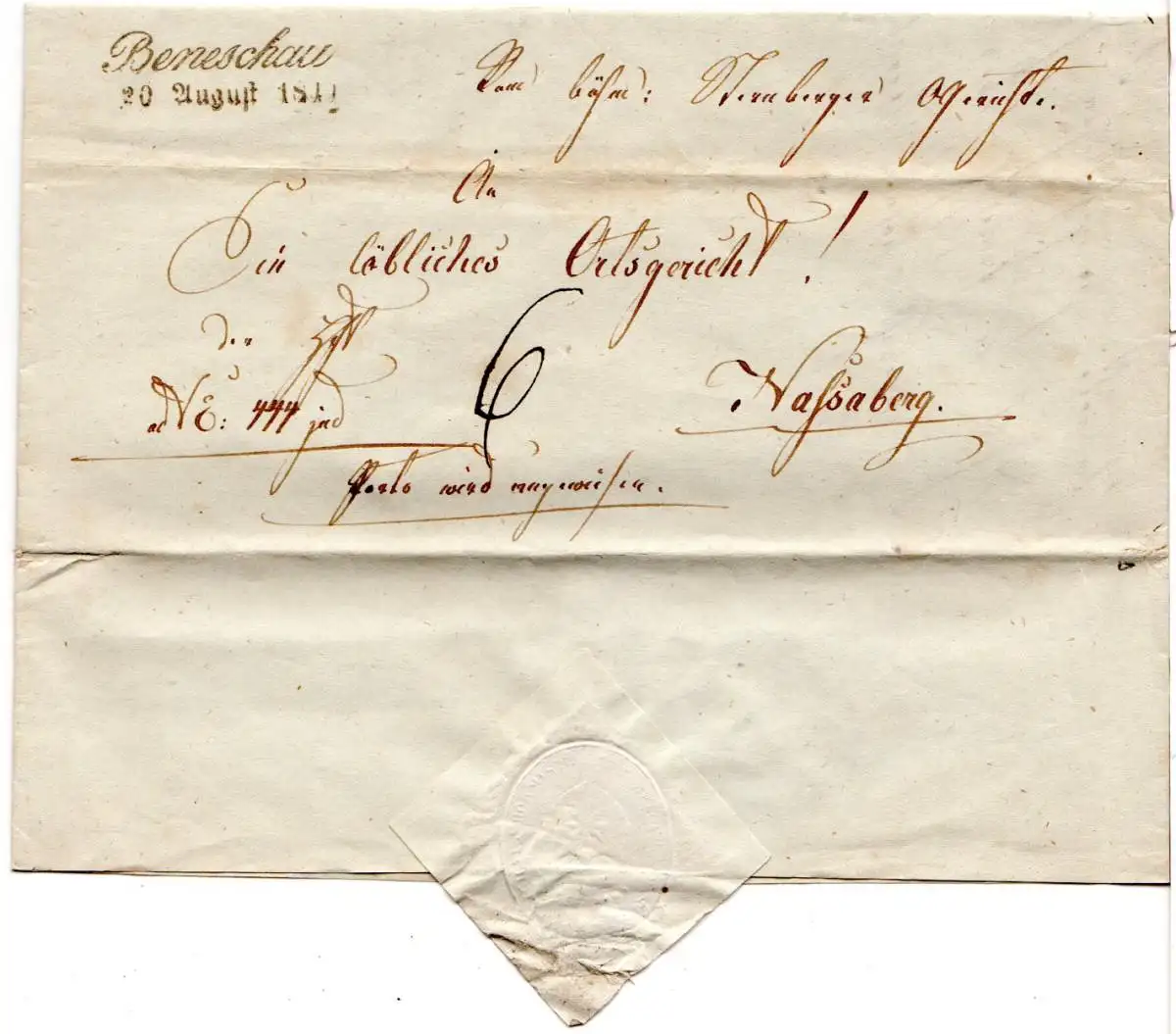Österreich 1844, Schreibschrift-L1 Beneschau + Datum klar auf Brief n. Nassaberg