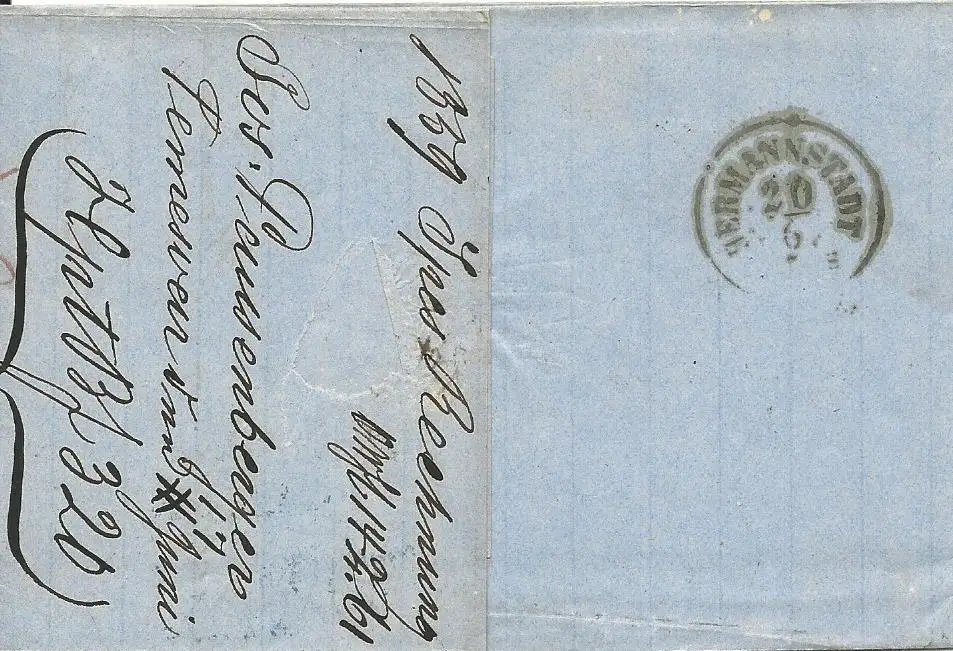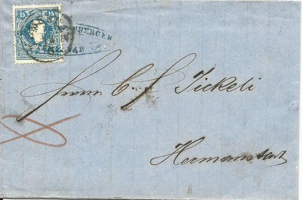 Ovale blaue Firmen Vorausentwertung "Jos. Paussenberger Temesvar" (heute Rumänien) auf Brief m. 15 Kr. n. Hermannstadt.