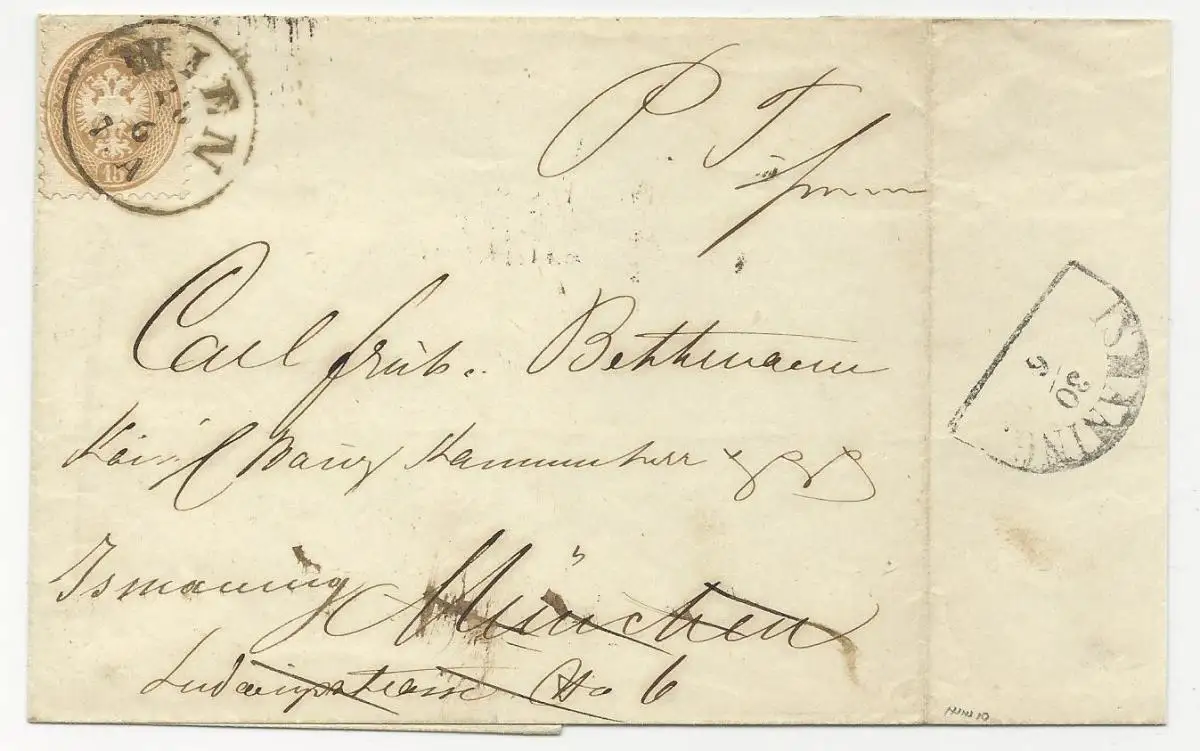 Österreich 1866, EF 15 Kr. auf Brief v. Wien n. Bayern. Nachsendung n. Ismaning