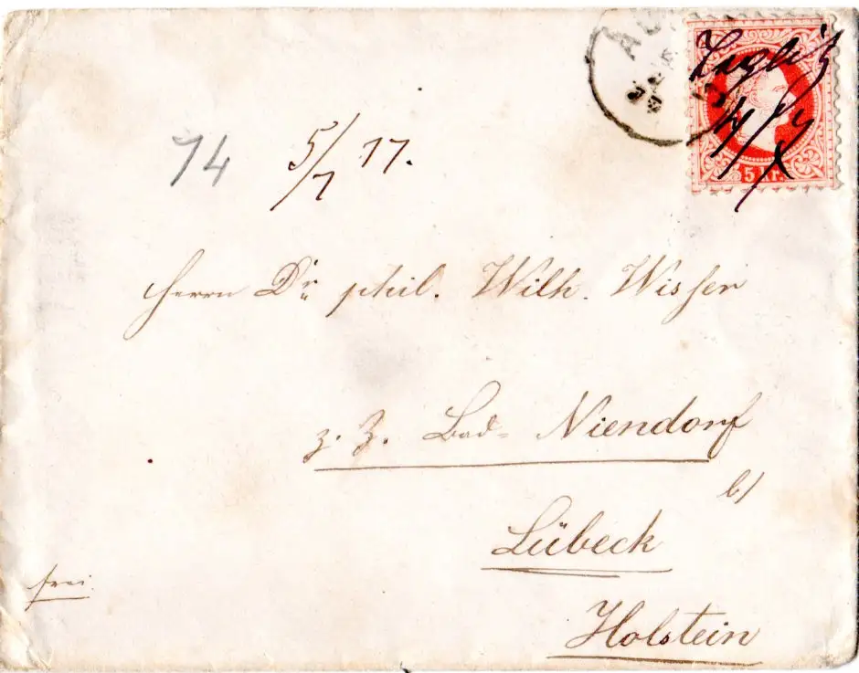 Brief nach Schleswig-Holstein m. Absendervermek Teplitz, Böhmen Haus Habsburg. Ungewöhnliche Doppelentwertung!