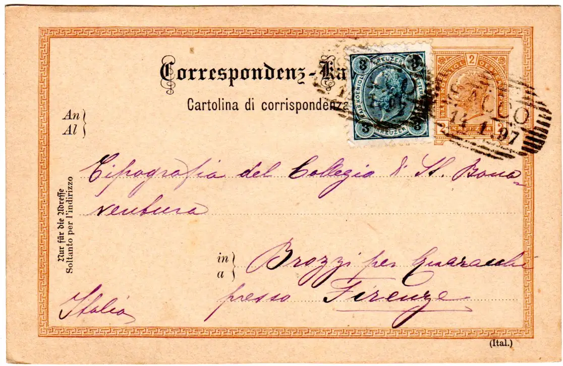 Ganzsache m. 3 Kr. Zusatzfrankatur m. Absenderangabe v. Isera per Rovereto u. Schraffenstpl. Sacco.