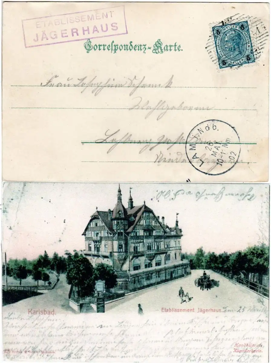 Österreich 1902, Schraffenstpl u. L1 Etablissement Jägerhaus auf Karsbad Farb-AK