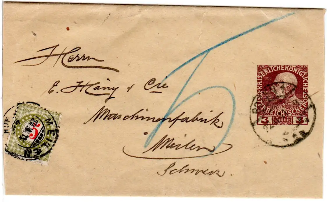 Österreich 1911, 3 H. Streifband Ganzsache v. Bozen m. 5 C. Schweiz Portomarke