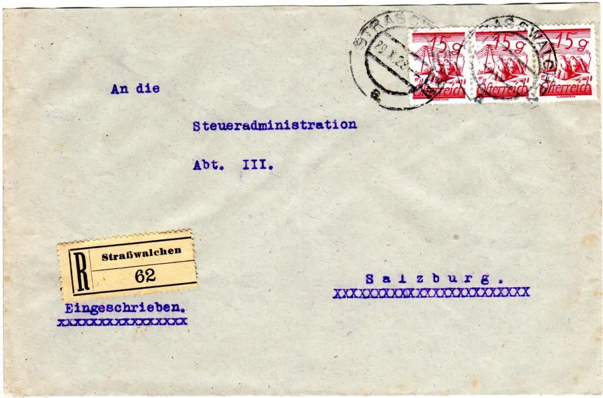 Österreich 1928, MeF 3er-Streifen 15 G. auf Einschreiben Brief v. STRASSWALCHEN