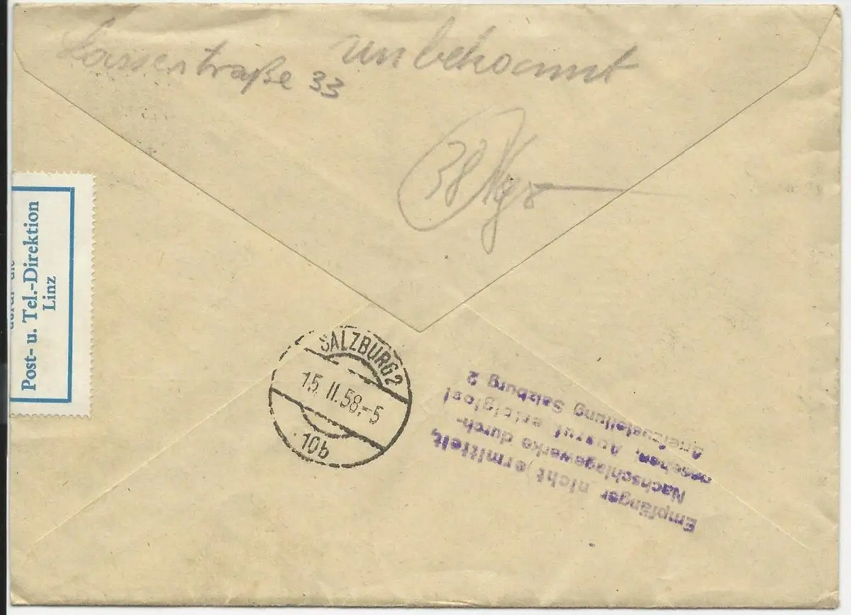 Österreich 1958, "amtlich geöffnet Linz"-Label auf Retour Brief Salzburg. #2912