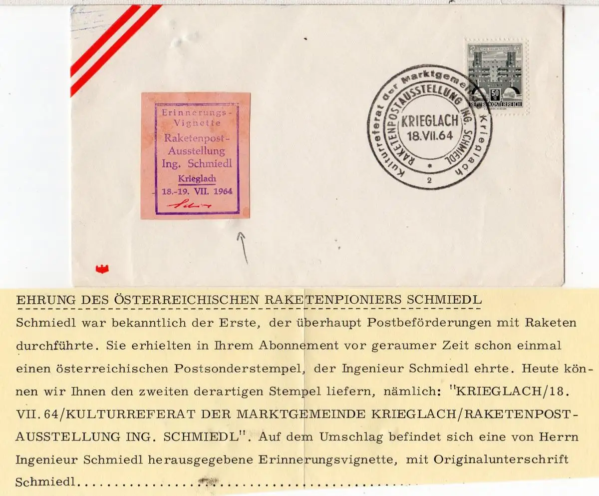 Sonderbrief m. Erinnerungsvignette Raketenpost-Ausstellung Ing. Schmiedl Krieglach 18.-19.VII.1964 m. Originalunterschrift sowie entsprechendem Sonderstempel.