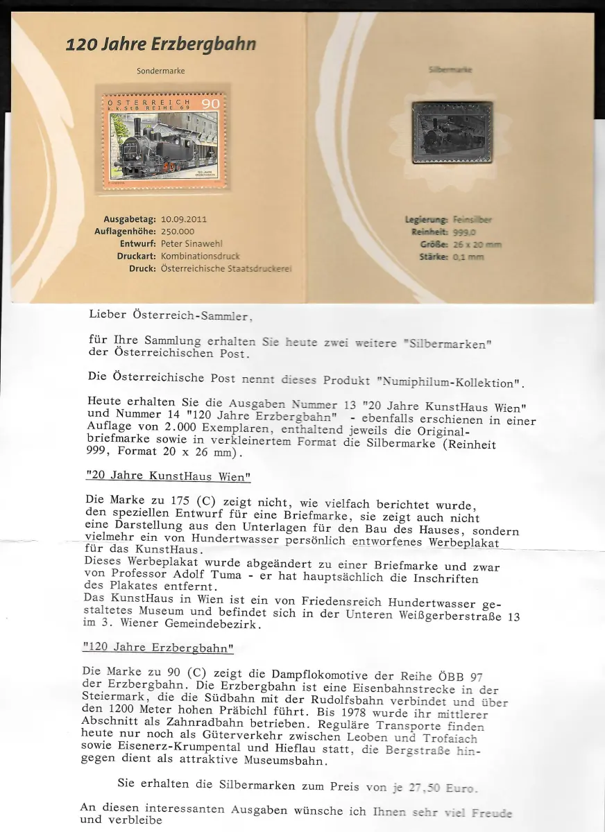 Österreich 2011: Silbermarke #14, 120 Jahre Erzbergbahn, Feinsilber 999