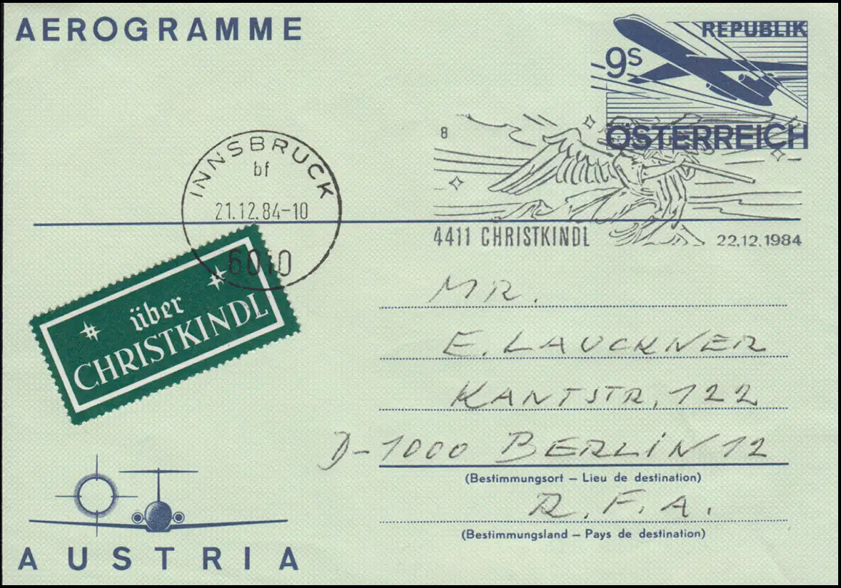 Autriche Aerogrammes LF 19 avec SSt CHRISTKINDL Engel avec flûte 22.12.1984