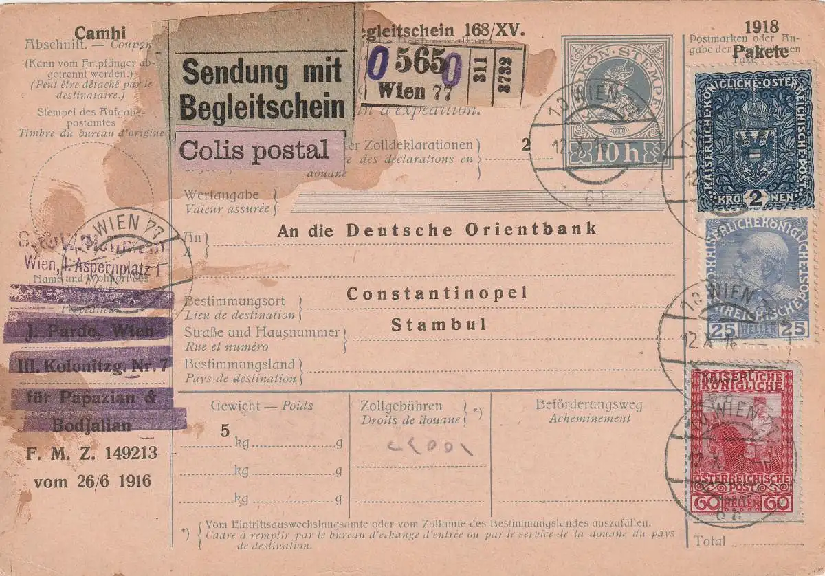 Paketkarte an die Deutsche Orientbank in Constantinopel, frankiert u.a. mit Nr. 200 II (Michel 100,00 €). Sehr schöne attraktive Bedarfserhaltung.