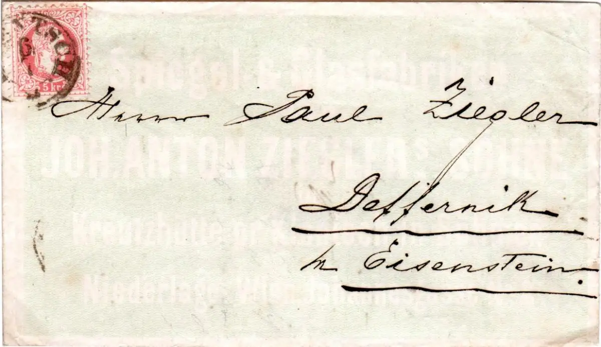 5 Kr. auf Reklame-Zier Umschlag Spiegel- & Glasfabriken, Joh. Anton Ziegler´s Söhne, Kreuzhütte pr. Kontsch in Böhmen, Niederlage: Wien Johannesgasse No.2. Adressiert n. Deffernik pr. Eisenstein (Deffernik, deutscher Name von Debrník, Ortsteil von Železná Ruda, deutsch Markt Eisenstein, Okres Klatovy, Plzeňský kraj, Tschechien). Ank.Stpl. rückseitig.