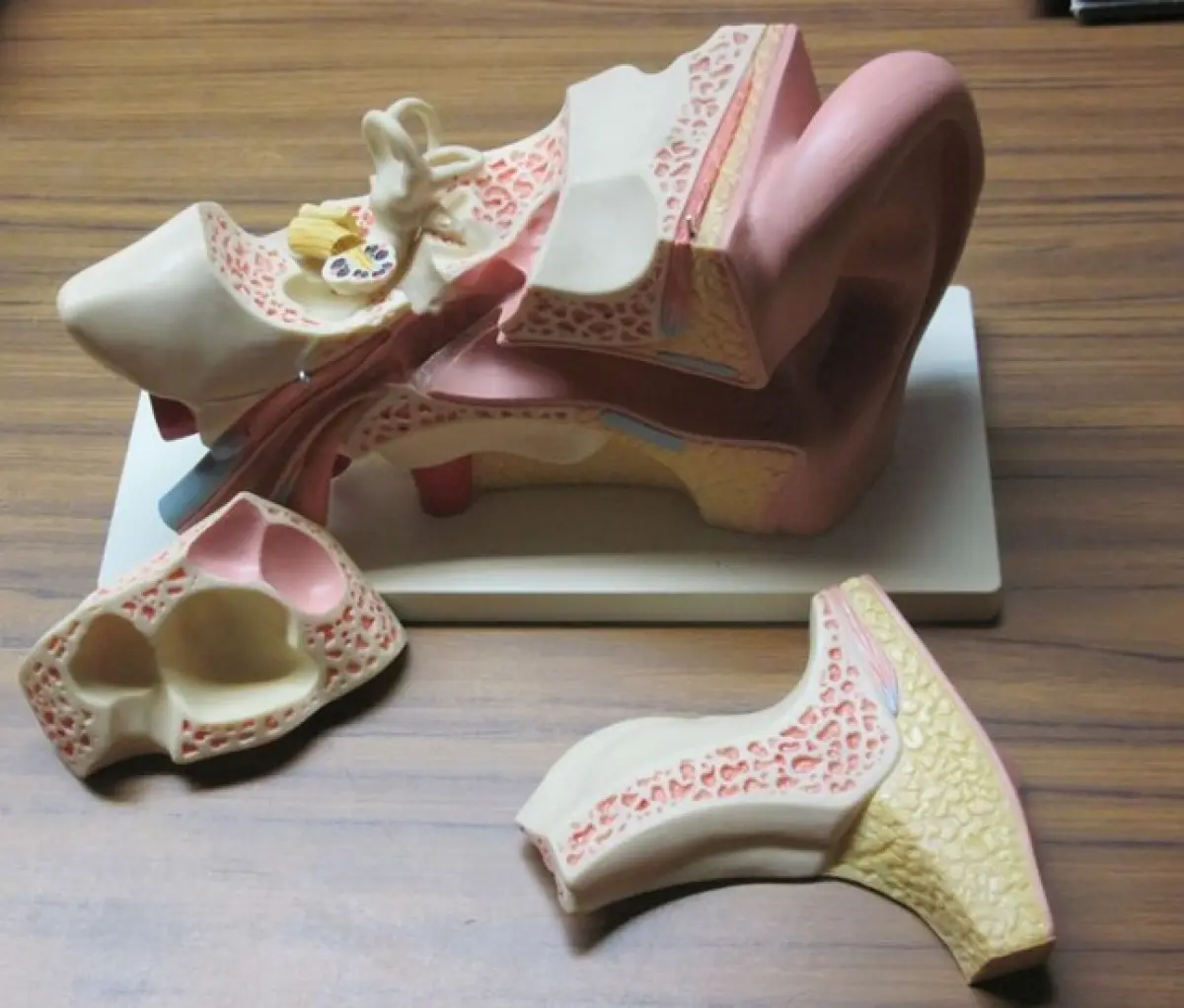 34 x 15,5 x 19 cm. Kunststoffmodell ohne Herstellerangabe - Mehrfarbige, auseinandernehmbare Kunststoffstücke, verschraubt auf einer Kunststoffplatte. Das Trommelfell mit Hammer und Amboss fehlen, vorhanden sind Steigbügel, Bogengänge und Schnecke. Die einzelnen Teile des Organs klein benummert, jedoch ohne Legende. Siehe auch Abbildungen
