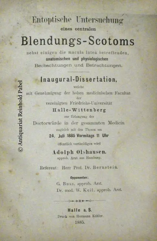 Olshausen, Adolph: Entoptische Untersuchung eines centralen Blendungs-Scotoms, nebst einigen die macula lutea betreffenden, anatomischen und physiologischen Beobachtungen und Betrachtungen. Diss. med. an der Friedrichs-Universität Halle-Wittenberg.