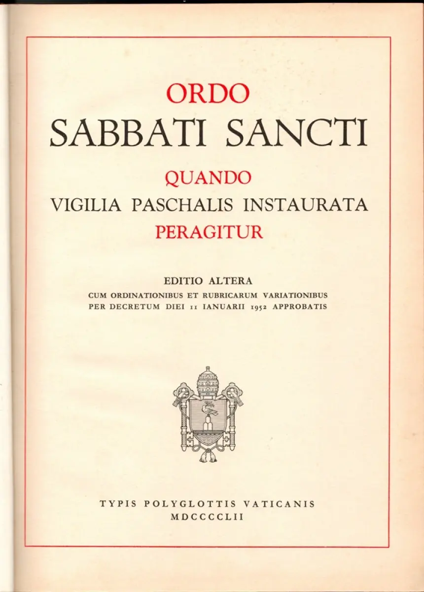 Ordo sabbati sancti, quando vigilia paschalis instaurata peragitur. Ed.altera. Cum ordinationibus et rubricarum variationibus per decretum diei 11 ianuarii 1952 approbatis.