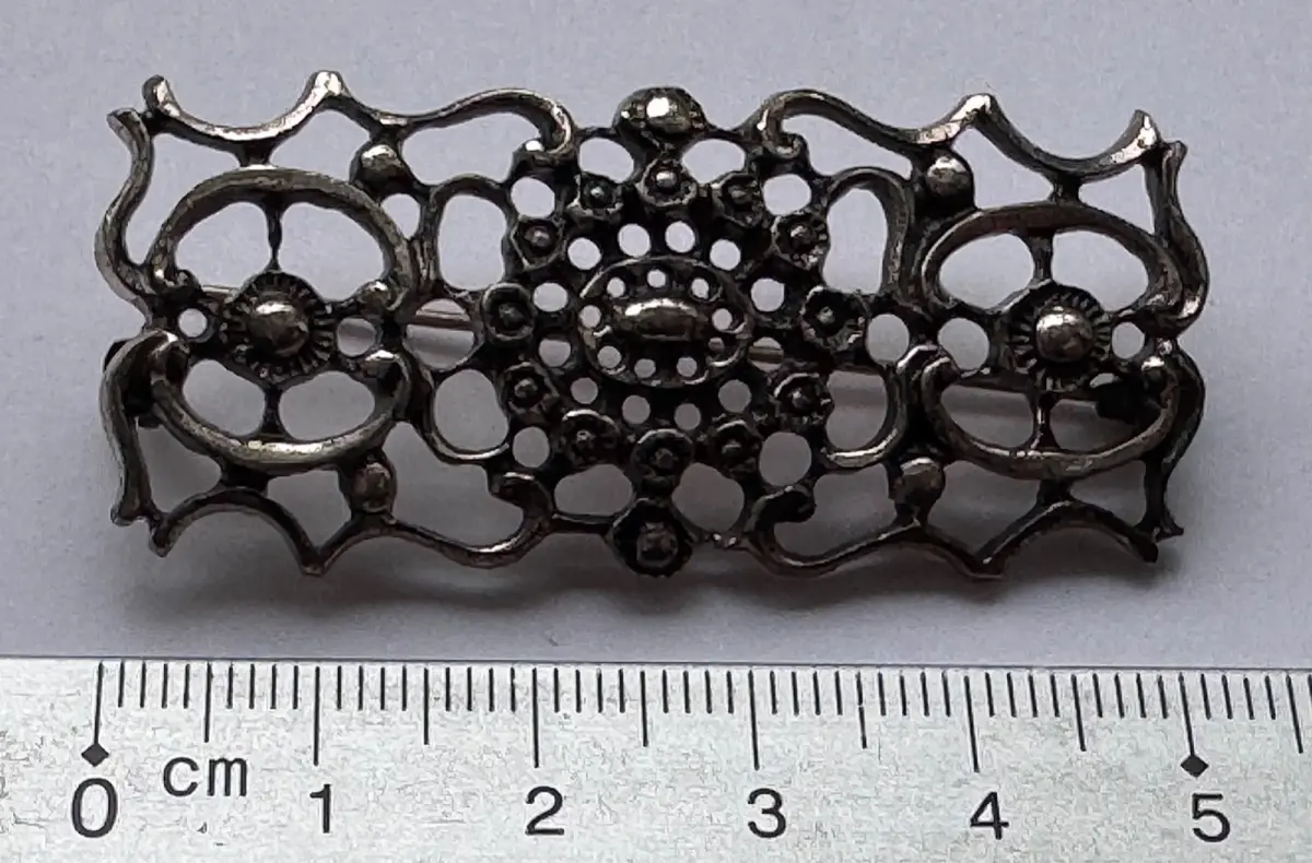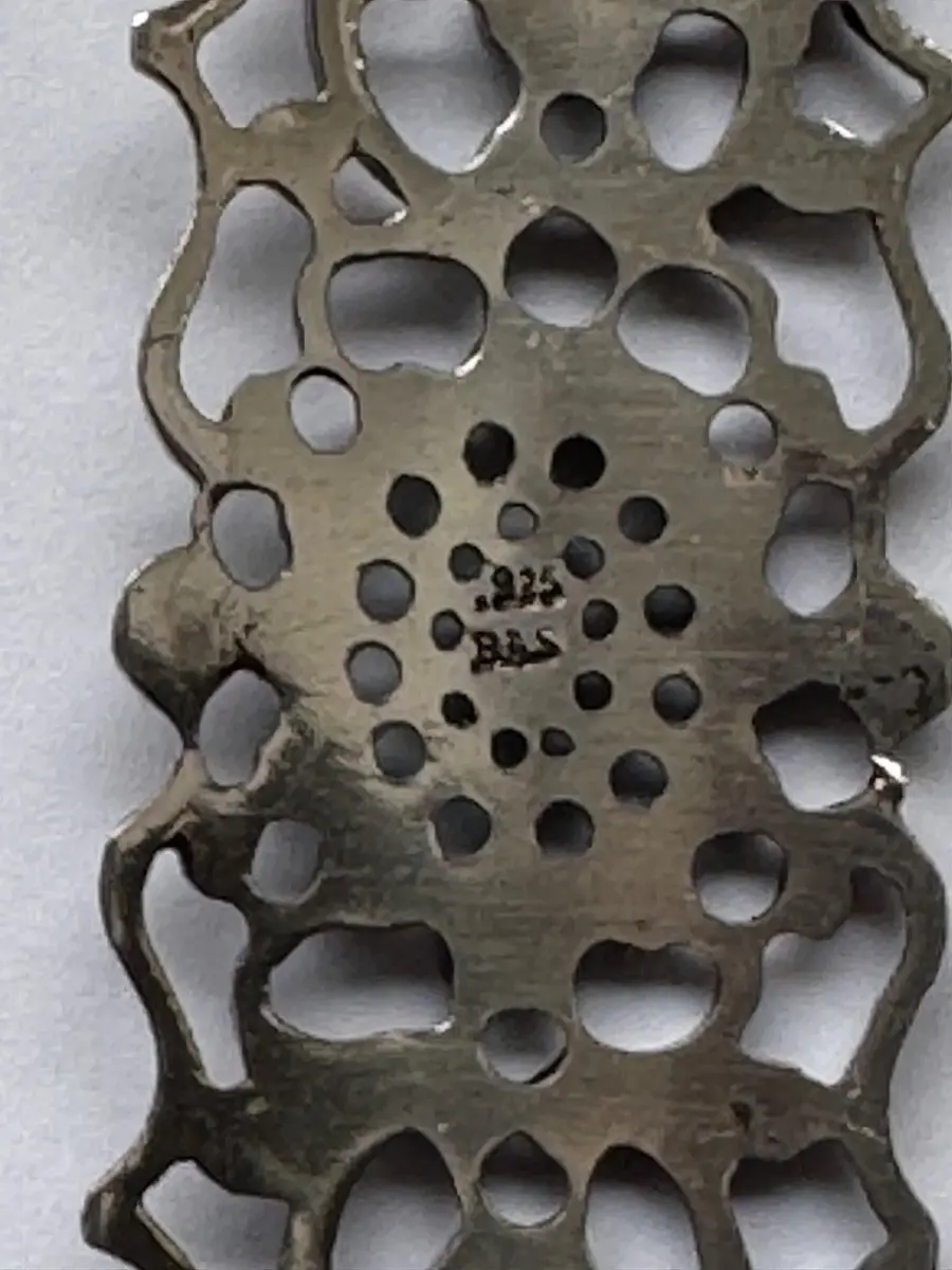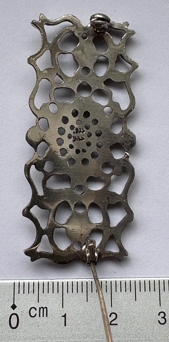 Der „BAS“-Stempel findet sich häufig auf englischem oder deutschem Silberschmuck des 20. Jahrhunderts. Er wurde von verschiedenen Werkstätten verwendet – am bekanntesten ist er als Marke von „Bernard Instone“ bzw. „BAS – Birmingham Assay Silver“, oft bei filigranen Broschen oder handgearbeiteten Silberelementen.
