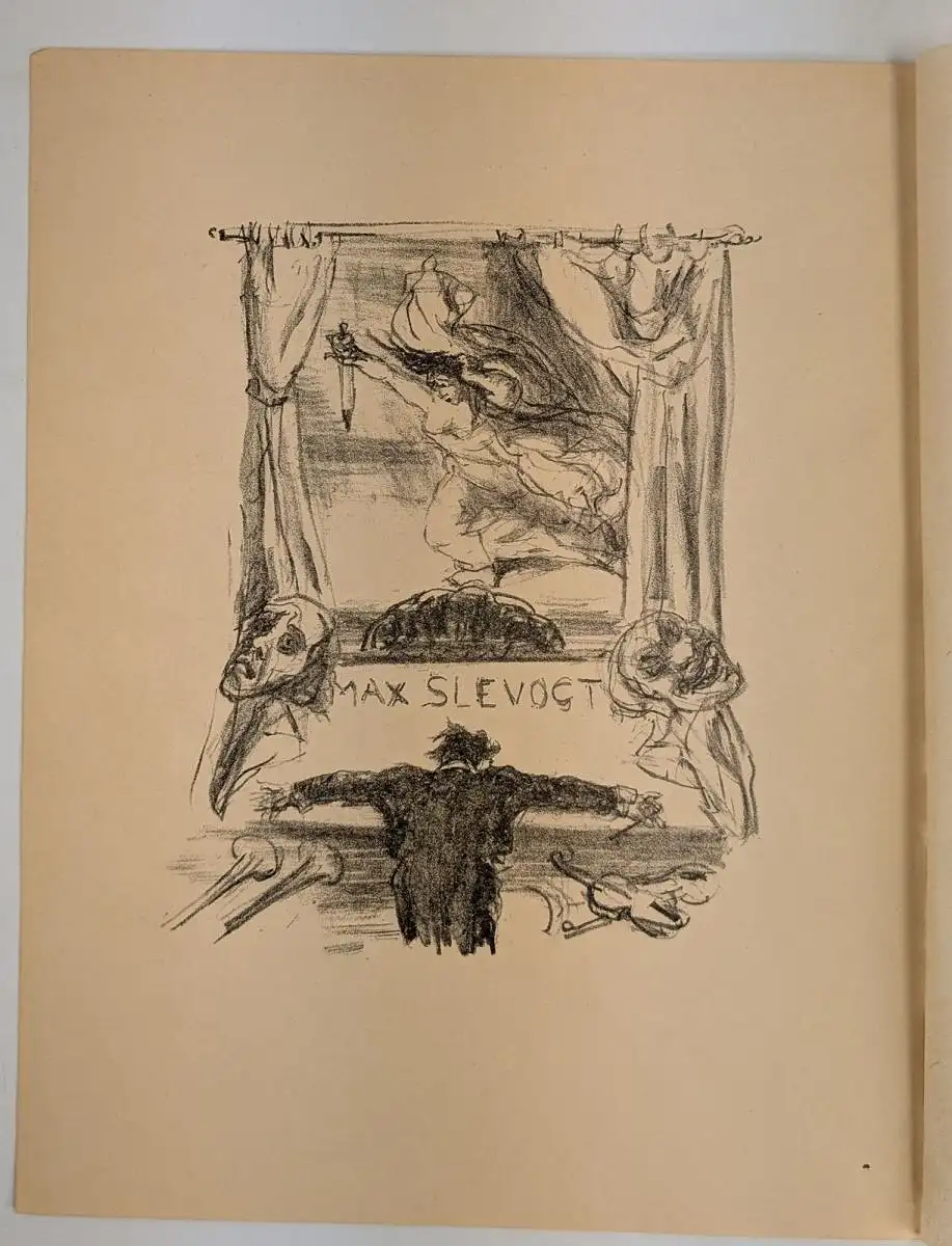Bemerkungen: Zustand: Altersbedingt minimal gebräunt und minimal fleckig // Originallithografie von Max Slevogt. Motivmaß 22,0 x 18,0 cm. Am rechten Rand ist ein Blatt Seidenpapier angebracht auf welchem Künstler und Titel aufgedruckt sind. Zusammengeklappt liegt der Titel somit mittig unter dem Motiv. Die Grafik ist, Dank ihres Schutzpapieres in einem sehr guten Zustand. Alle Kreidestrukturen der Zeichnung sind klar und ohne Verunreinigungen zu sichtbar.