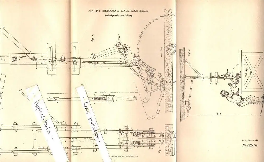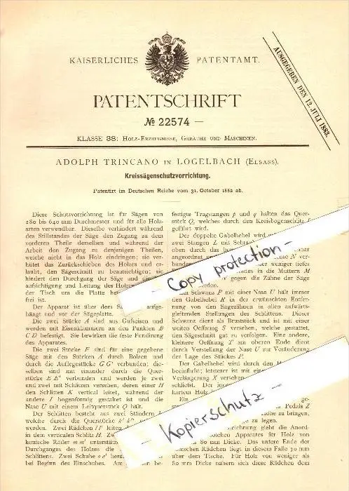 Original Patent - Adolph Trincano à Logelbach / Wintzenheim , 1882 , Saw - dispositif de protection , Colmar !!!