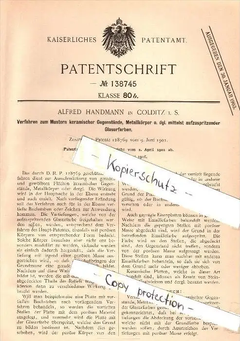 Original Patent - Alfred Handmann in Colditz i.S., 1902 , Mustern von Keramik mit Glasur !!!