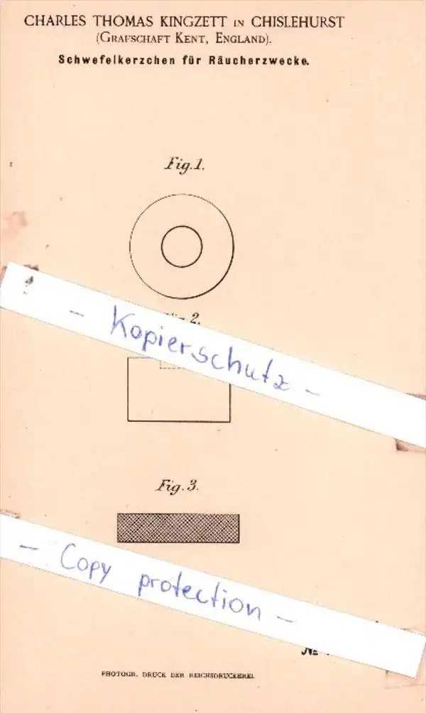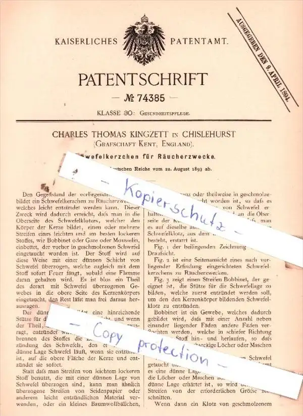 Original Patent - C. Thomas Kingzett in Chislehurst , 1893 , Schwefelkerzchen für Räucherzwecke !!!