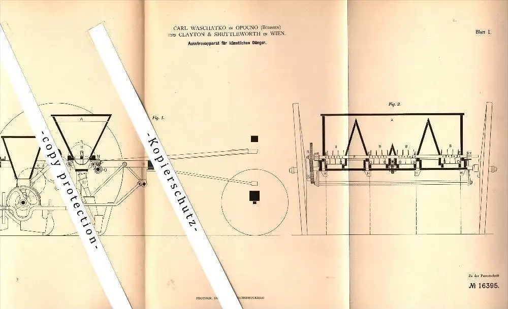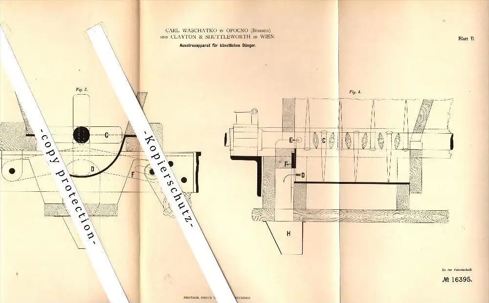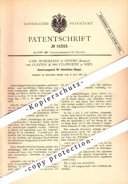 Original Patent - C. Waschatko in Opocno und Clayton & Shuttleworth in Wien , 1881 ,Apparat für Dünger !!!