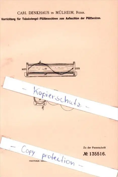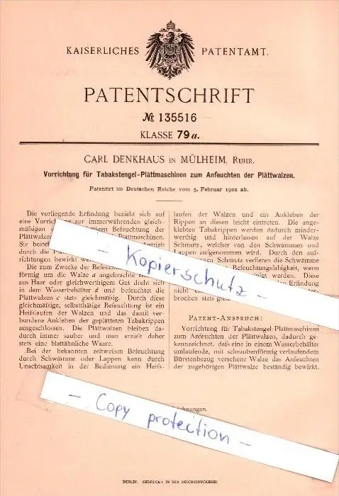 Original Patent - Carl Denkhaus in Mülheim , Ruhr , 1902 , Tabakstengel-Plättmaschinen , Tabak !!!